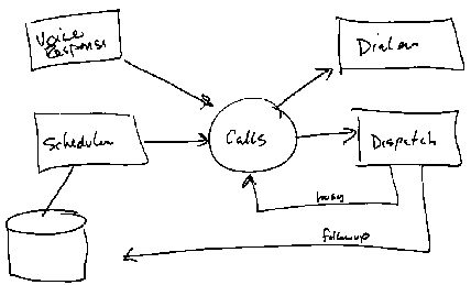 We distributed responsibility for these actions across our domain objects, device drivers, and the rather confusing objects: Scheduler and Dispatcher. The distinction between the two remained hard to grasp until we drew the flows into and out of the pool of active calls ...