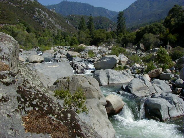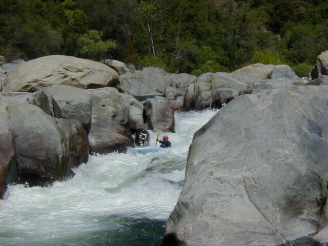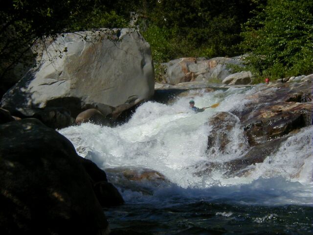 This run is longer than the one above, slightly less difficult and contains two very high gradient sections as well as a very long and difficult possible portage around the difficult waterfall and gorge below the Park Headquarters at Ash Mountain. Between the major major drops there is a surprising amount of the river that can be run by boat scouting or easy scouting from the bank. Everything is easily portable with the exception of the Gorge. High above on the right the road is never far away but the bank is steep and there is mega poison oak. This section is also sometimes refered to as The Hospital Rock Section by those who don't descriminate between the two sections. Very seldom is this run attempted in combination with the real Hospital Rock Section due to the high overhead and long day that results.