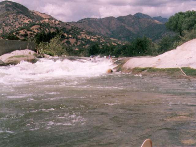 Flood of Jan 97 Update: No longer a cheap thrill. The stopper hole on the top makes a run off the nose even harder. The hole below the main drop is bigger and stickier than ever. Hug the left side of the main drop to avoid the hole. The high flow far left cheat route is still there above 1800 cfs.