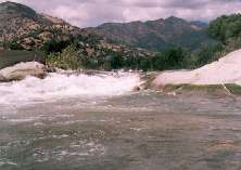 Flood of Jan 97 Update: The flood did some major rearranging of the river just above the confluence. Water now flows down the left bank right behind the Naturedome. Take either the first or second channel down to the confluence. Watch the piton rock in the center of the second channel.