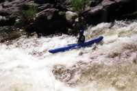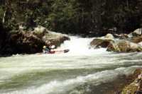 Scout left. Run from the right side eddy above the drop and try to make the turn back right at the bottom before the river stuffs you in the boulders on the left. More good whitewater follows.