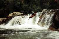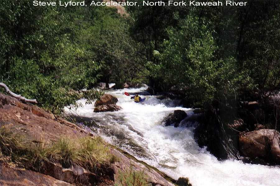 To get to the put-in cross the North Fork Bridge in the town of Three Rivers and drive 3.5 miles up North Fork Drive until the road crosses the river a quarter mile past the historic Kaweah Post Office. There is a new gauge on the left downstream side of the bridge footing (installed May 1997). A reading of 1.4 feet is a low water run at aprroximately 400 cfs. Above 2.5 feet this run will be cooking! The North Fork has been run as high as 3.0 ft. Continue on upstream 3.2 miles to Paradise Beach (BLM site). This is the take-out and is located where the road comes back down to the river level just before going uphill and away from the river for good. The put-in is another 5 miles upsteam. 4 miles upstream the road forks and the left fork goes through a gate and down to the river at the confluence with Yucca Creek. Just before the road splits there is a good view down into the canyon of the first big drop (Portage #1). It's best to run the North Fork with someone with previous North Fork experience. Plan on a very long day if it is your first descent without guidance from a boater with North Fork experience. Alot of the drops are semi blind from above. There are trees growing out of the river in some places. The overall character is pool drop but some of the continuous sections are quite long. The put-in is on Sequoia Park land and take-out is on BLM land, so, unlike the main Kaweah, there is no access problem. The road from the gate 0.8 miles above the put-in at Yucca Flat is closed by CDF after the start of fire season. This is not usually a problem unless it is a big water year and the North Fork is still running in summer (as was the case in 1998). It's a 20 minute walk to the river if the gate is closed. The author ran the North Fork 9 consecutive days in the summer of 1998 and has come to enjoy it immensely once the river was memorized.